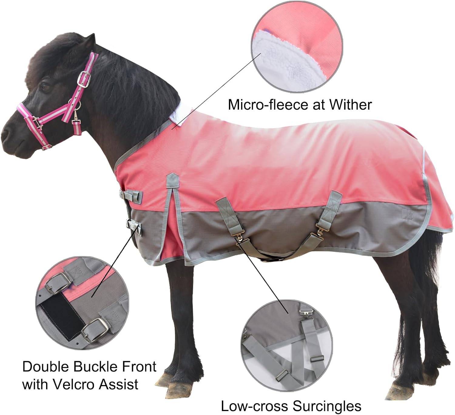 - Secure Fit: Heavy-duty adjustable double buckle front closure with Velcro assist, plus cross surcingles underneath the belly provide a secure fit during turnout. Extended shoulder gussets grant greater freedom of movement.